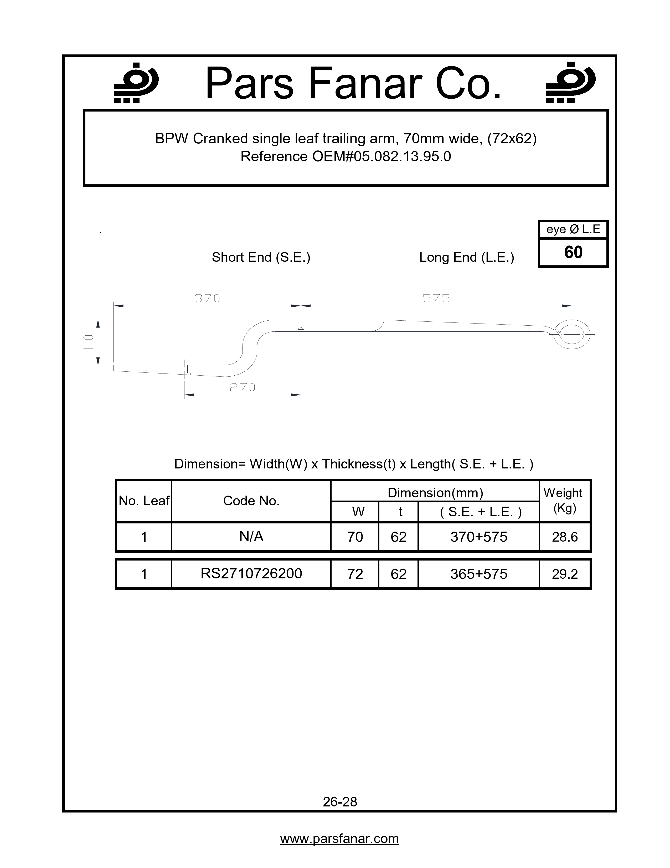 BPW Cranked single leaf trailing arm, 70mm wide, (72×62)