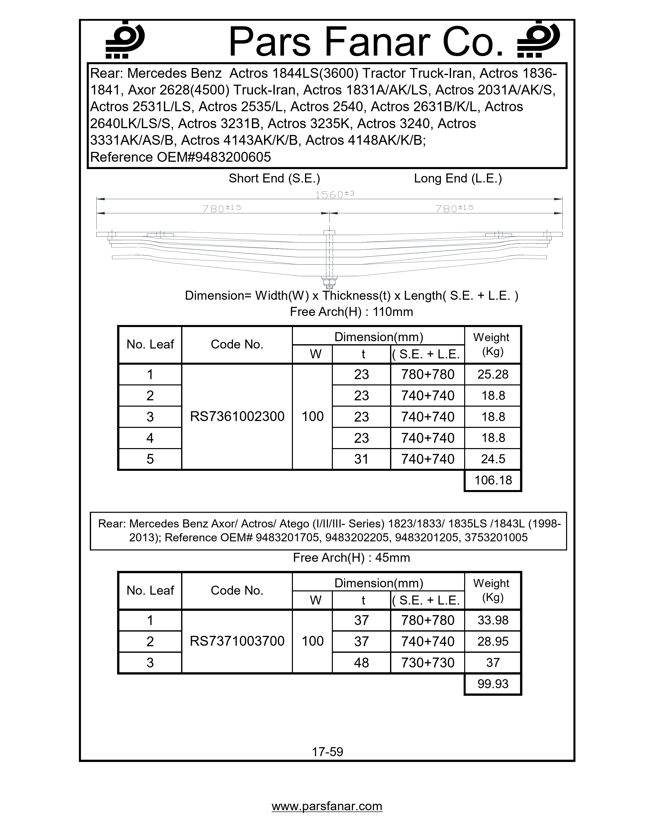 | Name of the vehicle/cabin/trailer | Actros 1831A/AK/LS, Actros 1836-1841, Actros 2031A/AK/S, Actros 2531L/LS, Actros 2535/L, Actros 2540, Actros 2631B/K/L, Actros 2640LK/LS/S, Actros 3231B, Actros 3235K, Actros 3240, Actros 3331AK/AS/B, Actros 4143AK/K/B, Actros 4148AK/K/B, Axor 2628(4500) Truck-Iran, Mercedes Benz Actros 1844LS(3600) Tractor Truck-Iran |