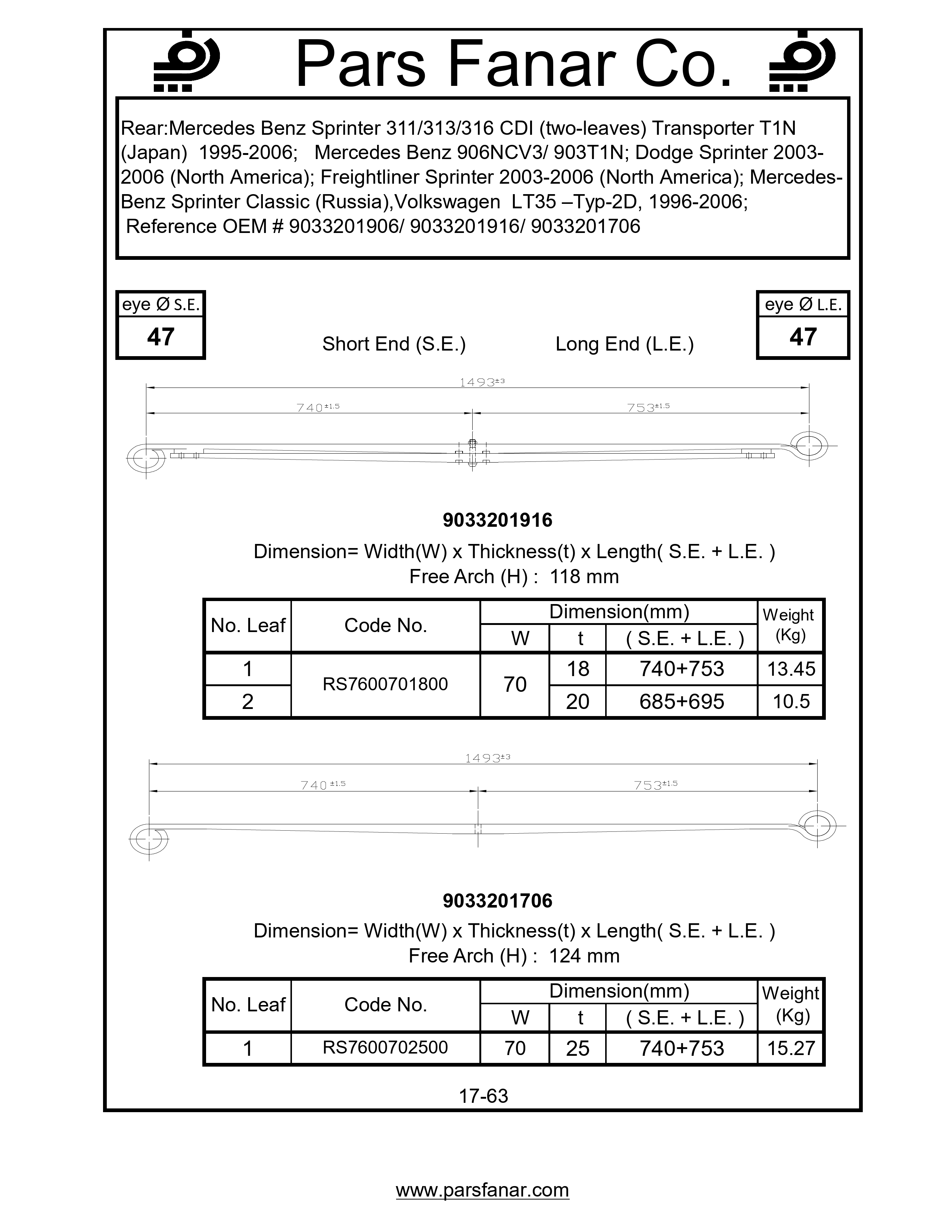 Rear: Mercedes Benz Sprinter 311/313/316 CDI (two-leaves) Transporter T1N (Japan) 1995-2006; Mercedes Benz 906NCV3/ 903T1N; Dodge Sprinter 2003-2006 (North America); Freightliner Sprinter 2003-2006 (North America); Mercedes-Benz Sprinter Classic (Russia),Volkswagen LT35 –Typ-2D, 1996-2006